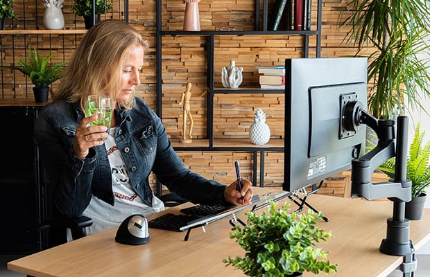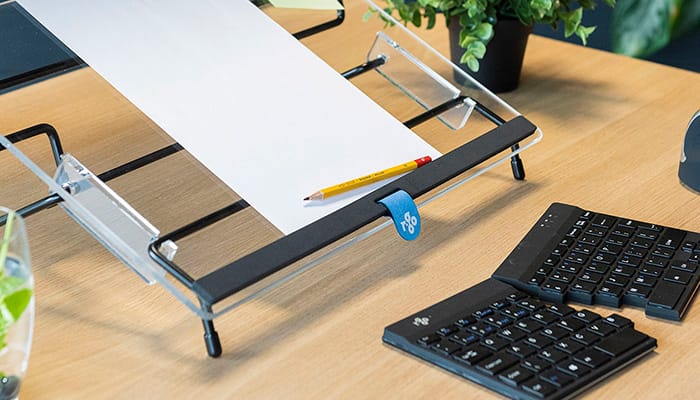 R-Go Flex Read è un supporto per documenti ergonomico e regolabile, che può essere utilizzato anche come scrivania per scrivere. Vuoi leggere documenti cartacei mentre lavori al computer? Posiziona il supporto per documenti tra la tastiera e lo schermo e regola l’inclinazione della scrivania nella posizione più verticale possibile. In questo modo assumerai automaticamente una postura corretta. Hai bisogno di prendere appunti? Tira il supporto per documenti verso di te e regola l’angolo di scrittura come desideri. Flex Read ha una capacità di carico di 5 kg ed è adatto per documenti fino al formato A3.